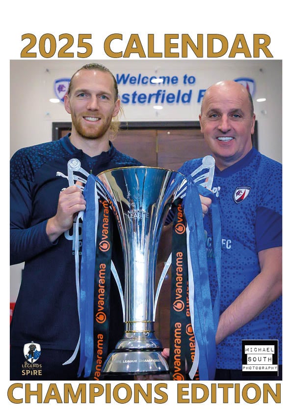 A calendar celebrating the Chesterfield FC title winning season from 2024. Featuring photographs from the title winning game vs Boreham Wood. The calendar also features the dates of all the wins that season and the birthdays of the players involved.